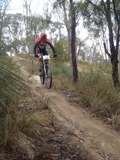 Crack goes the gun and the race was on. Jumping up into the main pack after a 30sec warm up I quickly blew up then recovered and before long was into a rhythm and cranking it out. The course was fast and not technical at all so not overly suited to me but it was bike riding none the less. 25 min into my start lap I had a rider decide to pass me on a fast decent. The racing line that I was on was smooth and offering plenty of traction where the line the other rider was going to pass me on had 2 tree roots sticking out about 3 inches and 1.5 meters apart so easy enough to double. How ever with the lack of technical descending ability to jump the roots he decided I was on the better line and merged into me.